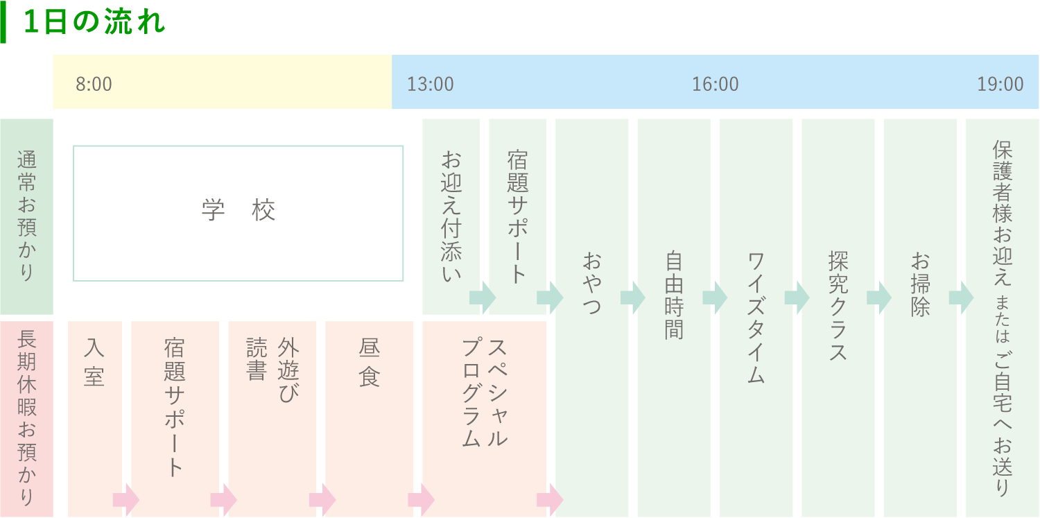 | お預かり時間 | 通常月:平日13:00~19:00 長期休暇月:平日8:00~19:00 (最長22時まで延長可能) |